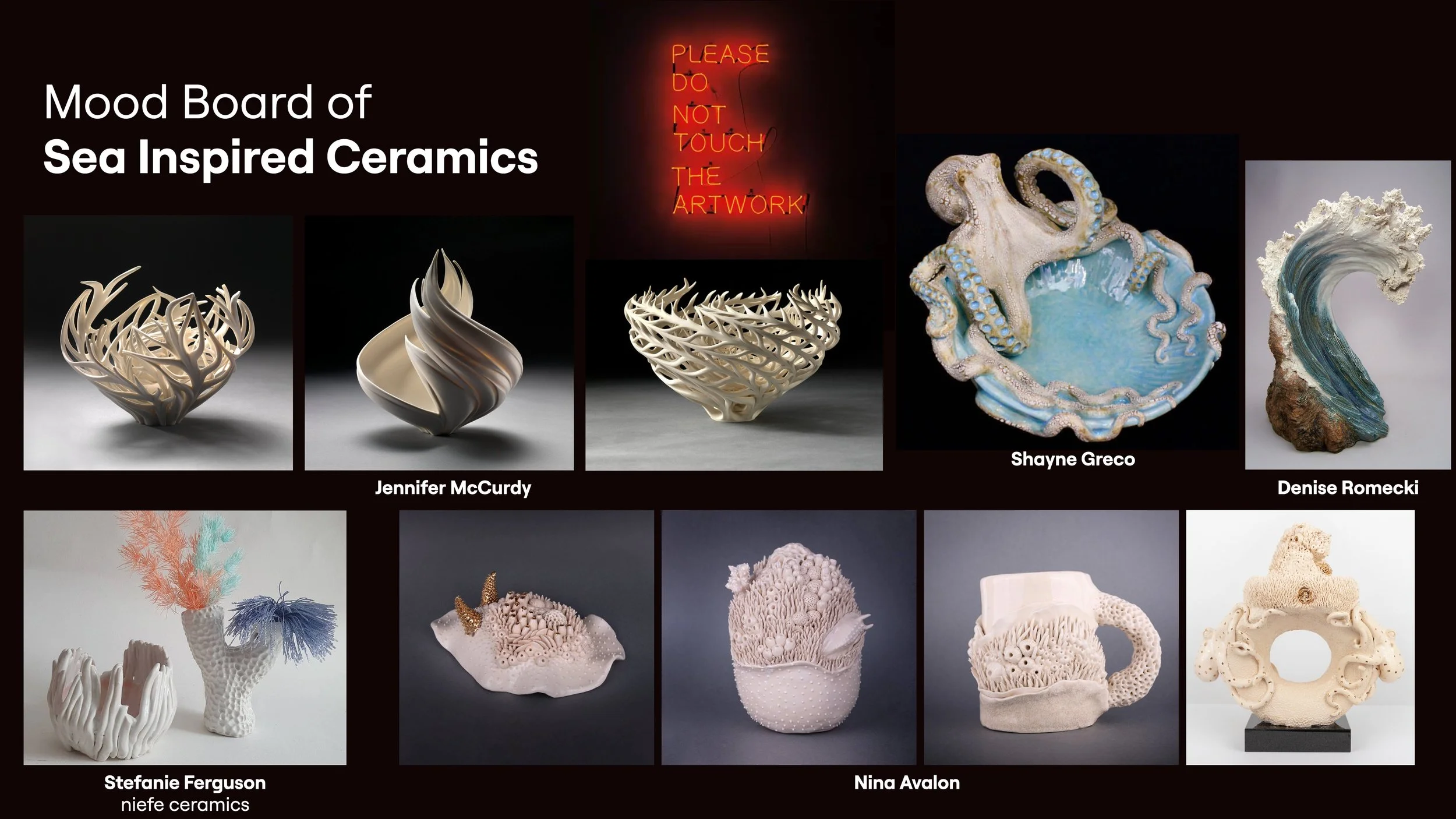 I then took a deeper dive into the theme of the sea, exploring the words, ideas, and environmental issues connected to it, as well as why I personally feel such a strong attachment to oceanic subject matter. At the same time, I evaluated my own skillset to determine what kind of artwork I might create, though I found myself naturally gravitating toward ceramics, where I feel most confident. Throughout this process, I also became increasingly interested in how art—haptic art in particular—can support neurodivergent people, which further shaped the direction of my research.