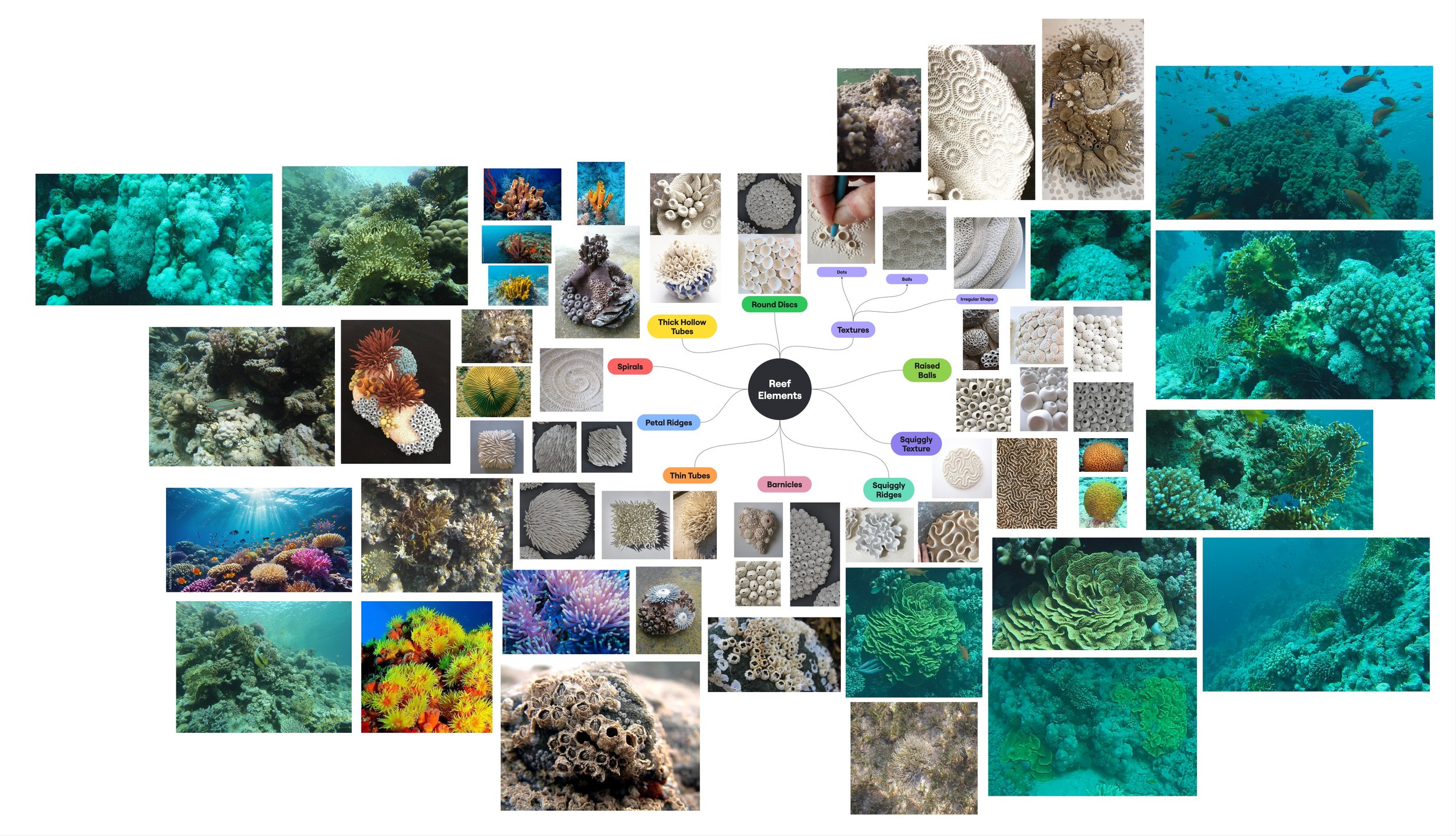 I drew on my diving experience and photos, internet image searches and Pintrest to create a mood board of some of the coral I wanted to feature on my reef letters.