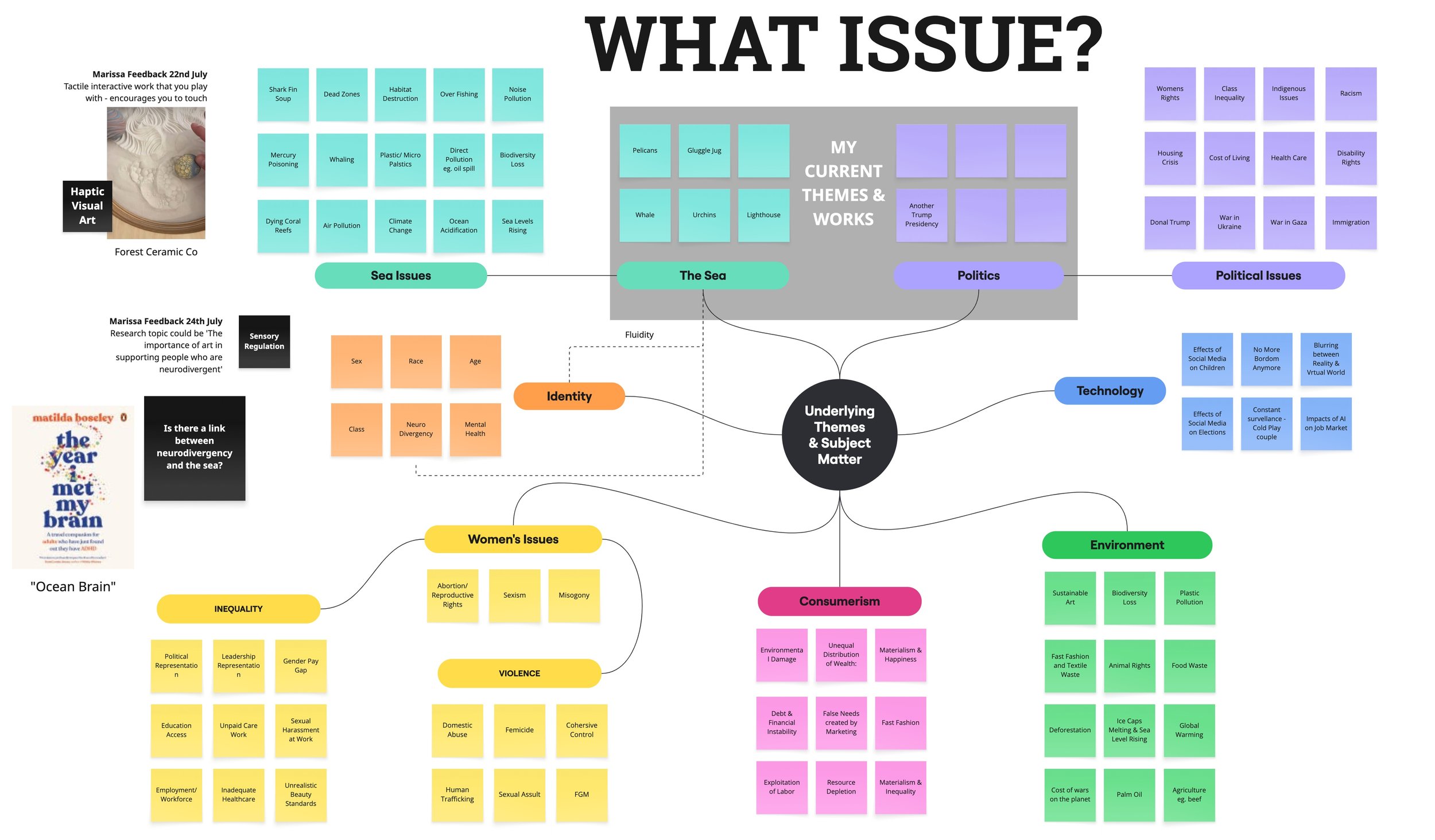 To determine the topic I wanted to research—and ultimately create an artwork around—I worked through several steps, including multiple mind maps. I began by examining the recurring themes in my existing work, with the sea emerging as the most prominent. I then listed the social issues I’m passionate about and explored possible connections between neurodivergence and the ocean. As I continued refining my focus, I identified haptic art as a potential direction. After discussing these ideas with my teacher Marissa, she suggested a clear research topic: the importance of art in supporting neurodivergent people.